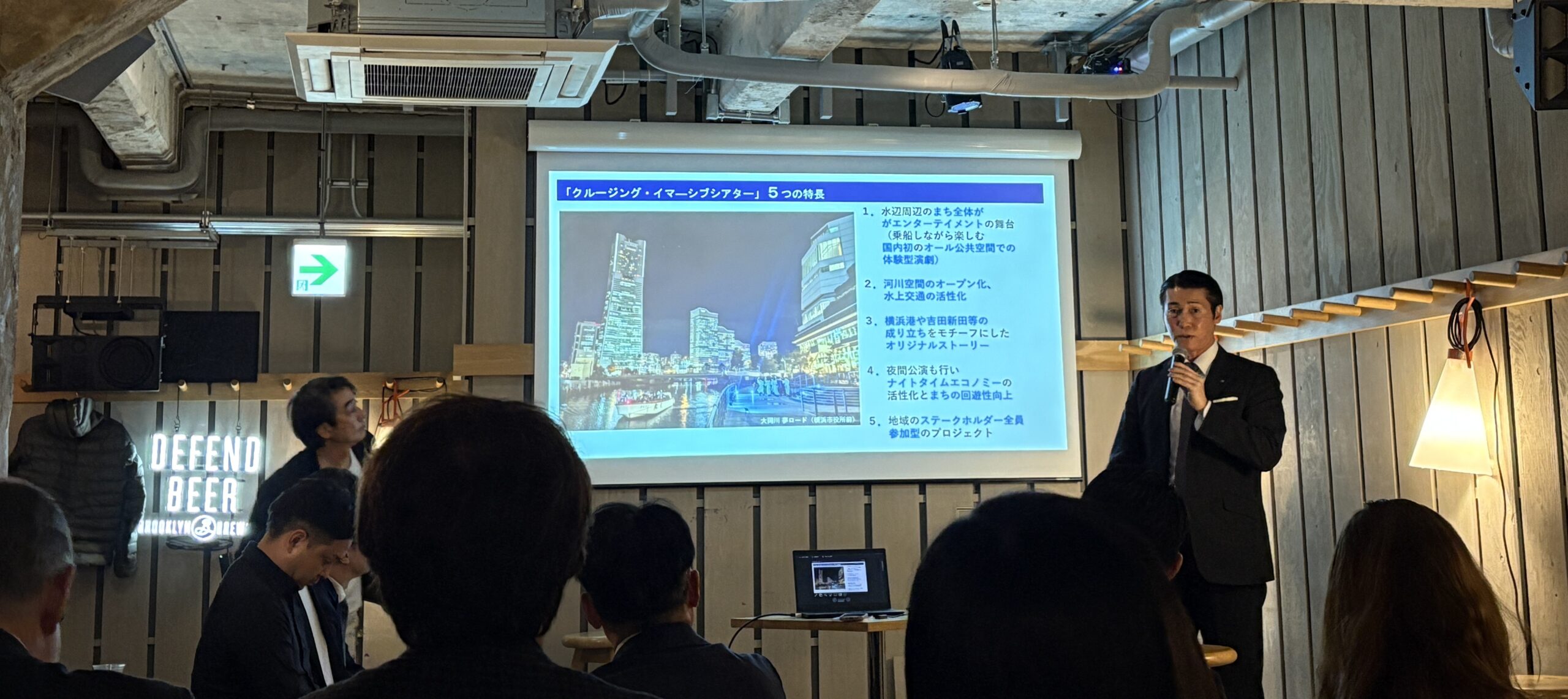 ショートプレゼンでは、2023年10月に横浜都心臨海部で実施した、観光庁「観光再始動事業」採択プロジェクト「クルージング・イマーシブシアター」をまち全体をエンターテイメントの舞台とした水辺空間活用事例として紹介。1日6公演の内、最も遅いスタートの21:00~22:30(Night View cruise)のナイトタイム公演が一番初めに完売したエピソードなどを紹介。ナイトタイムエコノミー推進に向けて、ハード整備のみならず、ナイトタイムにおける世界目線、まちづくり視点による、魅力的なソフトコンテンツ造成の必要性を説明しました。今後、日本橋界隈の水辺空間や墨田川沿いなどでの展開可能性が期待されます。
